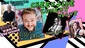 Creekside Comedy Night returns on Saturday, March 23rd for another evening of hilarious stand-up. Host Keith “Big Daddy” Dee will be joined by headliner Cliff Cash and featured comedians Shawna Jarrett and Bridgette Martin. The show starts at 9 pm.