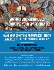 We are still receiving donations for this great cause. You may send donations to Liberating Lives Inc 3236 Landmark Drive,, North Charleston SC, 29418. Or to our website liberatingliveschs.org.
