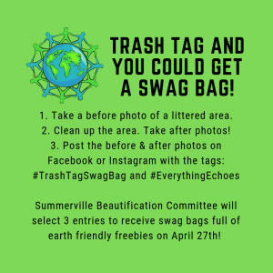 Organizers have already started the conversation by announcing, on the Summerville Clean Team social media pages, an online Trash Tag Swag Bag challenge that is open all week.