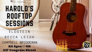 Harold’s Rooftop Sessions is an intimate singer-songwriter event held monthly on the rooftop of Harold’s Cabin at 247 Congress Street. The cover for this event is $10 (all ages) and is first come, first serve. Both cash and credit card are accepted.