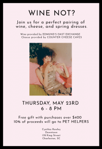 During the event, guests will celebrate women as they sample wine, cheese, and dress pairings all made by women. Guests will also receive a free gift with any purchase over $400. In addition, 10% of the evening’s profits will be donated to Pet Helpers.