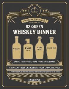 A portion of the sales from the Whiskey Dinner will go towards Catch Up on Lunch, a fundraising effort to help eliminate student lunch debt in Charleston, Dorchester, and Berkeley counties. Queen Street Hospitality restaurants, including 82 Queen and Swig & Swine, recently donated a check of over $17,000 to Catch Up on Lunch through a series of Spirit Nights hosted to raise money for the non-profit.