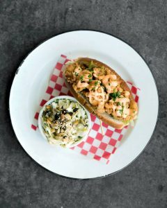 Leon’s friend oyster roll comes topped with lettuce, tomato, avocado, a “creamy comeback sauce” and chives. According to the current menu, it’s served with your choice of cucumber salad, slaw, or pea salad and costs $15.