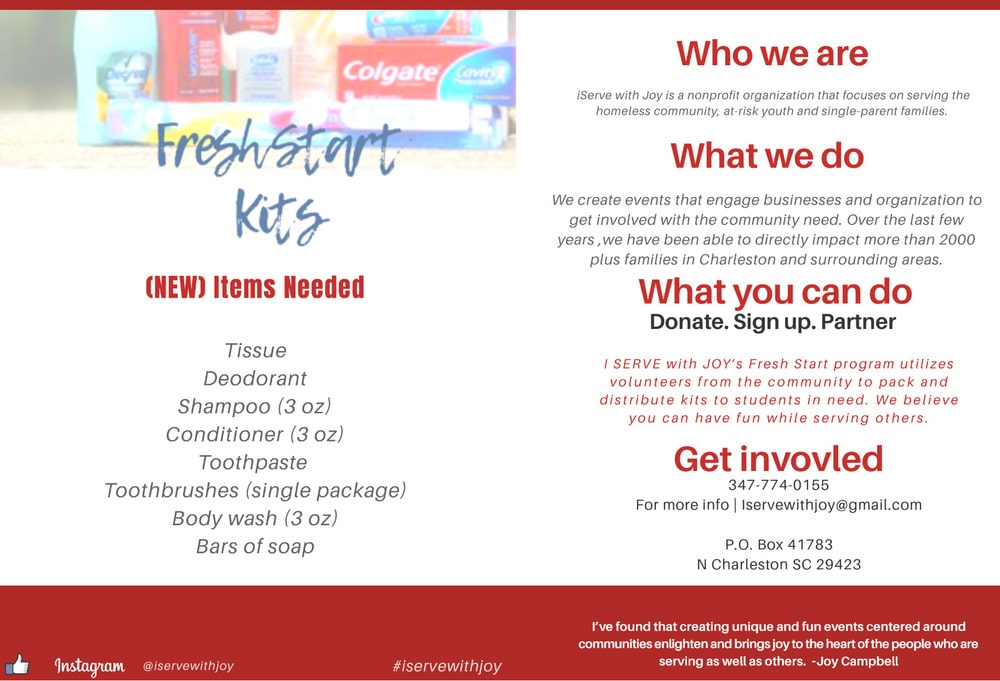 “The reason we are seeking assistance is because there is a greater need that is unspoken of, as I’ve witnessed myself while volunteering at local schools,” Joy Campbell, founder of I Serve With Joy, said. “I spearhead a Holiday Christmas party for displaced teens, assist with leadership, and education training programs and personally feel like no child should be held responsible for their living conditions. A ‘Fresh Start Kit’ is a way to help students not only with their personal self-esteem issues but to aide in support for families that have a tough time providing the bare essentials.”