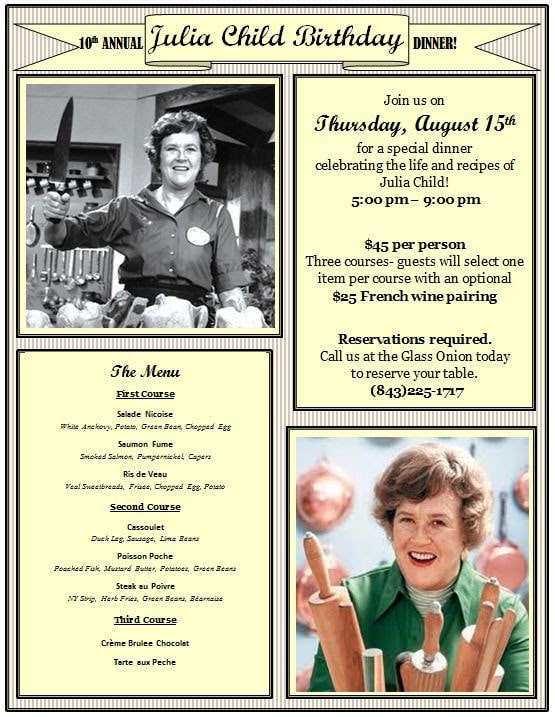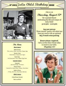 On Thursday, August 15th, The Glass Onion will host its annual celebration dinner in honor of Julia Child’s birthday. This year would have been the chef/author/tv personality’s 107th birthday.