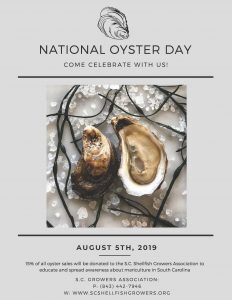The S.C. Shellfish Growers Association, a 501c(3) nonprofit organization, will be partnering with local restaurants on National Oyster Day, Monday, August 5th, and the weekend before, to raise funds, spread awareness, and educate the public on sustainable mariculture practices in our state.