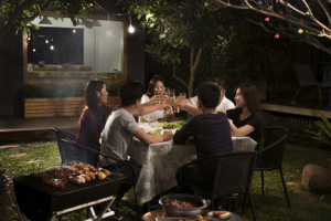 For a fun outdoor movie night, set up a mini portable projector on a white wall or cloth and choose one that uses LED lights to project images. Snuggle up with your loved ones and enjoy the show.