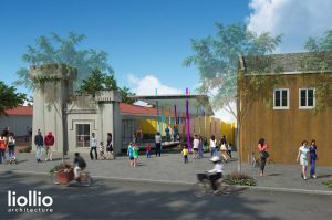 The pavilion, designed by Liollio Architecture, is complimented by brightly colored skewed steel columns inspired by the childhood game Pick Up Sticks®. The pavilion will allow the museum to add additional exhibit space outdoors, including Port Go Go Go and Lottawatta Island, and will help create a new front entry and public face for the Museum on Ann Street.