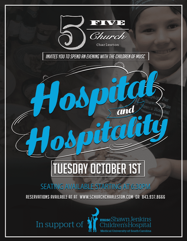 On October 1st, beginning at 6:30 pm, miracle patients will have the chance to host, cook, and serve alongside 5Church Executive Chef Adam Hodgson and the rest of the 5Church team. Reservations can be made at www.5ChurchCharleston.com. Space is limited and reservations are recommended.