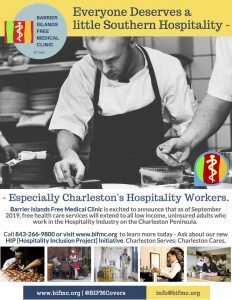 The HIP (Hospitality Inclusion Project) Initiative will aim to expand patient eligibility and provide free healthcare, specialty referrals, and low/no cost prescription services to all uninsured adults ages 18-65 who serve the hospitality industry on the Charleston peninsula, inclusive of all downtown food, beverage and lodging businesses.