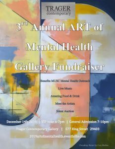 ALL proceeds from VIP/event/raffle ticket sales – as well as 10% of any gallery art sold in connection with the event – will go directly to MUSC’s Department of Psychiatry and Behavioral Sciences and the Institute of Psychiatry to support the important department-wide initiatives of patient care, education, and cutting edge research. This year, MUSC patients are also providing art for sale and 100% of the proceeds of those sales will be donated to the fund.