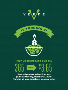 Verde to Celebrate 8th Anniversary with $3.65 “Saladbration”