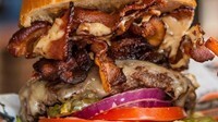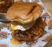 The Bacon Cheeseburger on Steroids is a spicy all beef delight, that will easily excite your taste buds. A seven ounce handcrafted burger, layered with six, you got that right a full half dozen thick slices of bacon (three apple smoked & three jalapeno infused), topped with your favorite garden veggies, Monterey jack cheese, on a fresh bun slathered with house-made bacon mayo. Jalapeno saturated in the bacon provides just enough kick without setting your mouth on fire. The petite hand-cut French fries are an ideal complement to this ‘beefed up’ taste sensation.