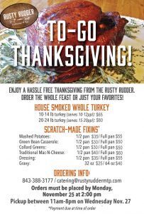 Call 843-388-3177 or e-mail catering@rustyruddermtp.com to submit your order by 2 pm on Monday, November 25th. You can pick up at The Rusty Rudder (3563 N. Hwy 17), between 11 am to 8 pm on Wednesday, November 27th. Payment is due at time of order.
