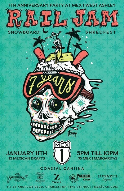 The forecast for Saturday, January 11th, 2020 is calling for snow in West Ashley – about 20,000 pounds of it! However, the blizzard will be localized to the area around Mex 1 Coastal Cantina as they host their 7th Annual Snowboard Rail Jam and Anniversary Party.
