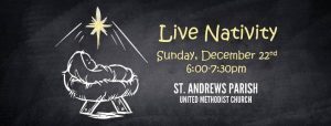 On Sunday, December 22nd, St. Andrews Parish UMC in West Ashley will host a live nativity presentation and choral performance at 6 pm in the church yard. The performance will repeat every half hour.