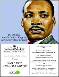 The City of North Charleston Cultural Arts Department is proud to sponsor the annual Martin Luther King Jr. tribute concert by the popular and internationally acclaimed Lowcountry Voices on Saturday, January 18, 2020, at 5 pm. The concert, titled Hold Fast: I Dream a World, will take place at St. Matthew Baptist Church, located at 2005 Reynolds Avenue, North Charleston. Admission is free, but an entry ticket is required.