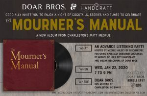 On Wednesday, January 22nd, Doar Bros. and Holy City Handcraft invite the community out for a night of stories, cocktails and tunes, hosted by Meggie Hulsey of Disco Teepee. Guests will be able to listen to, The Mourner’s Manual, a new album from Charleston’s Matt Megrue in advance of the release.
