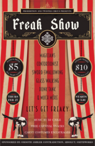 In the mood for something freaky? Then Prohibition has the event for you. The downtown restaurant will partner with the New York City based sideshow troupe Twisted Circus for The Freak Show Party on February 27th.