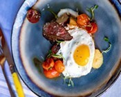 You can play it safe with Steak & Eggs. The presentation and preparation might be a little different but it’s incredible nonetheless. Thin and tender marinated hanger steak (butcher’s cut) draped over half cut skillet potatoes, all under two eggs any way you want them. I suggest sunny-side up, so the warm and yellow yolk will further enhance the flavor of the entrée’. Perfectly seasoned and extra yummy!