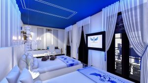 The Saint Hotel rooms offer a tranquil, casual opulence that soothe and stimulate the senses, and are perfect for the guest who is looking forward to a deep and restful night’s sleep. Interiors of the 45 guest rooms, designed in a white and indigo blue palette, are modern and sleek with a touch of baroque including a white sofa and chairs; bedside tables and a dining table made from Carrera marble; plus deep blue ceilings and a white Venetian glass chandelier.