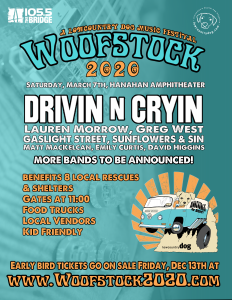 Lowcountry Dog Magazine, along with Pet Supplies Plus, The Bridge at 105.5, and 98 Rock present WOOFSTOCK 2020: A Lowcountry Dog Music Festival on Saturday, March 7th at the Hanahan Amphitheater. This all-day, kid and dog-friendly music festival will feature several bands, food trucks, and eight local rescue groups.
