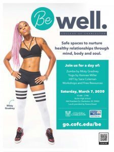 The College of Charleston Office of Institutional Diversity (OID) is hosting its second annual Be Well Expo from 9:15 am to 2 pm on Saturday, March 7th, at Burke High School (244 President Street). With breakout sessions, resource tables, and hands-on engagement activities, this year’s daylong wellness event will focus on creating safe spaces to nurture healthy relationships through mind, body, and soul.