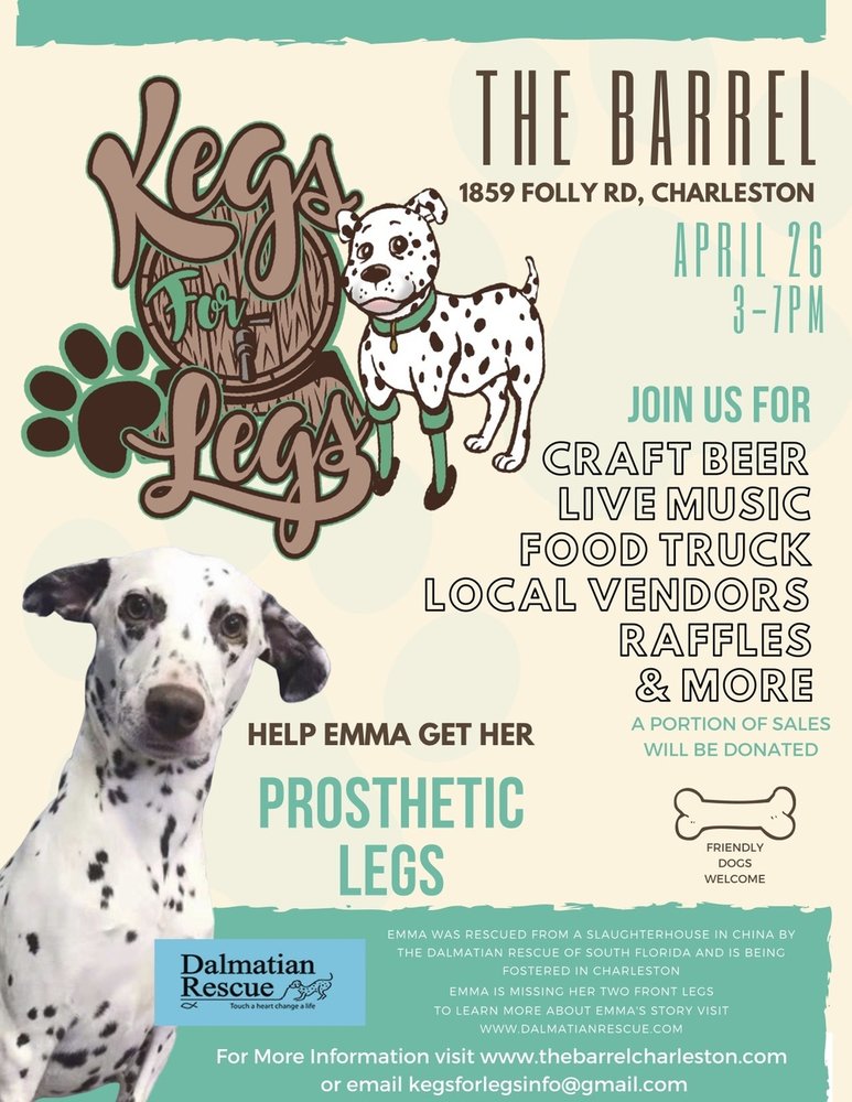“Kegs For Legs” will take place at The Barrel, a local pet-friendly bar with a wide variety of craft beers on tap. The Barrel is located at 1859 Folly Rd. The Barrel welcomes well-behaved dogs to attend the event and features an enclosed off-leash area for dogs to enjoy. The Barrel will donate a percentage of sales toward the purchase of Emma’s prosthetic legs.