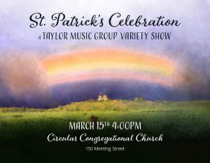 The Taylor Music Group (TMG), a leading Charleston arts organization focused on the blending of classical and folk music, announces its annual popular St. Patrick’s Day concert on Sunday, March 15th at 4 pm at Circular Congregational Church. The concert will feature performances by Na Fidleiri, Charleston’s famed Celtic fiddling ensemble, instrumentalists Bart Saylor, Jim Carrier, Karin McQuade and Andrae Raffield, dancer Maura Jennings, as well as singers Dr. Saundra DeAthos, Emmalee Hinson, Kiri Taylor, and host Rob Taylor.