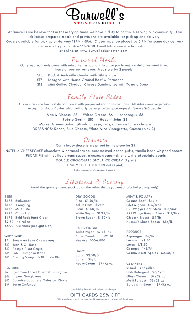 The current environment makes the traditional restaurant model no longer viable. Therefore, Burwell’s has shifted its focus to prepared meals and grocery delivery. With a continued focus on food service to the community, the former (and future) steakhouse wants to do its part to help “flatten the curve.”