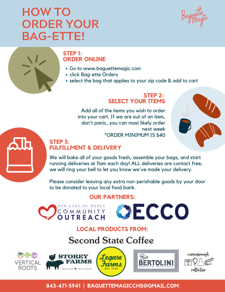 Locally-owned bakery and restaurant, Baguette Magic, has launched Bag-ettes, a weekly delivery service bringing fresh baked goods, groceries, and more to doorsteps around Charleston. Online ordering and zero contact deliveries provide an easy way to support local businesses from the safety and comfort of their own homes.