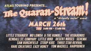 On Thursday, March 26th, Atlas Touring Presents “The Quaran-Stream,” an online streaming music festival uniting live touring bands from different regions of the country. Each region will host their own live stream coordinated to one main “Quaran-Stream” from 3 pm to 11 pm.