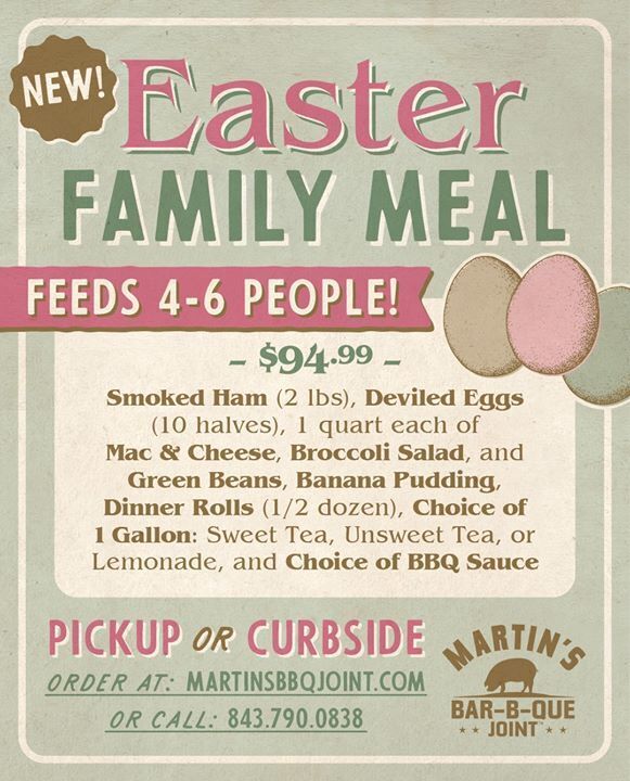 - Easter Dinner Deal. Call to place your order before Friday (4/10) at 8 pm for Sunday (4/12) pickup