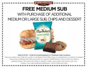 From now until April 26th, Firehouse Subs is offering guests a FREE medium sub with the purchase of an additional medium or large sub, chips, and dessert by showing this coupon at the register or mentioning it over the phone.