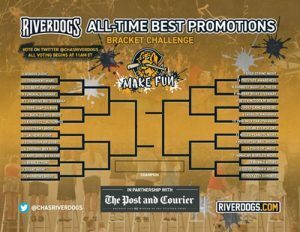 The Charleston RiverDogs unveiled today on Twitter an All-Time Promotional Night Bracket in which fans will vote for their all-time favorite promotion. Voting for each round will begin Tuesday and continue daily at 11 am on the RiverDogs’ Twitter page, where fans will choose from 32 of the RiverDogs’ zaniest promotional events.The bracket challenge, which is being released and presented in conjunction with The Post and Courier – which has covered nearly every one of the promotional nights – features two 16-team halves: one with “recent” promotions from the past six years, and one with “classics” dating as far back as the inception of the RiverDogs in 1994. Many of the promotional themes are the brainchildren of longtime RiverDogs president Mike Veeck and other members of the RiverDogs staff. Many of those staff members, including Veeck, longtime general manager Dave Echols, promotions director Nate Kurant, and at least three past promotions directors, will share their recollection of the events through a series of content shared on RiverDogs social media.