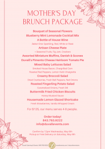 Duvall Catering & Events has created a special Mother’s Day package that includes everything needed to celebrate and honor the superhero moms and loved ones in your lives. The package includes an array of brunch delights, plus flowers, wine, and a blueberry lemonade mix for your favorite cocktail. Packages can be picked up or delivered to your special someone.