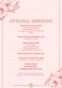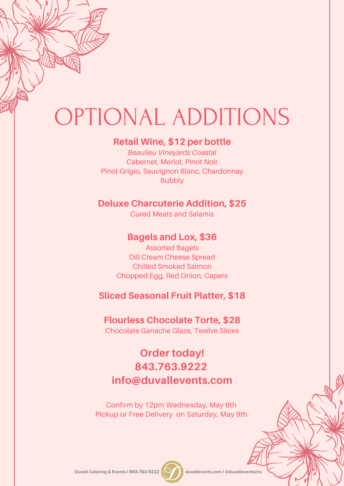 Orders may be placed until Wednesday, May 6th by calling 843-763-9222 or via email to info@duvallevents.com.
