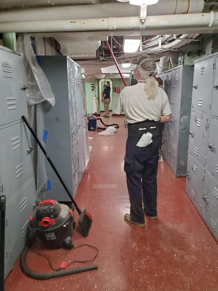 While closed because of COVID-19, the Patriots Point staff has been hard at work stripping and repainting tour routes, ladder wells and open spaces aboard the museum’s flagship. The process includes blowing dirt and dust from the overhead areas, scraping off old paint, and then recoating the ship bulkheads and decks using the original U.S. Navy soft white, gray or green colors.