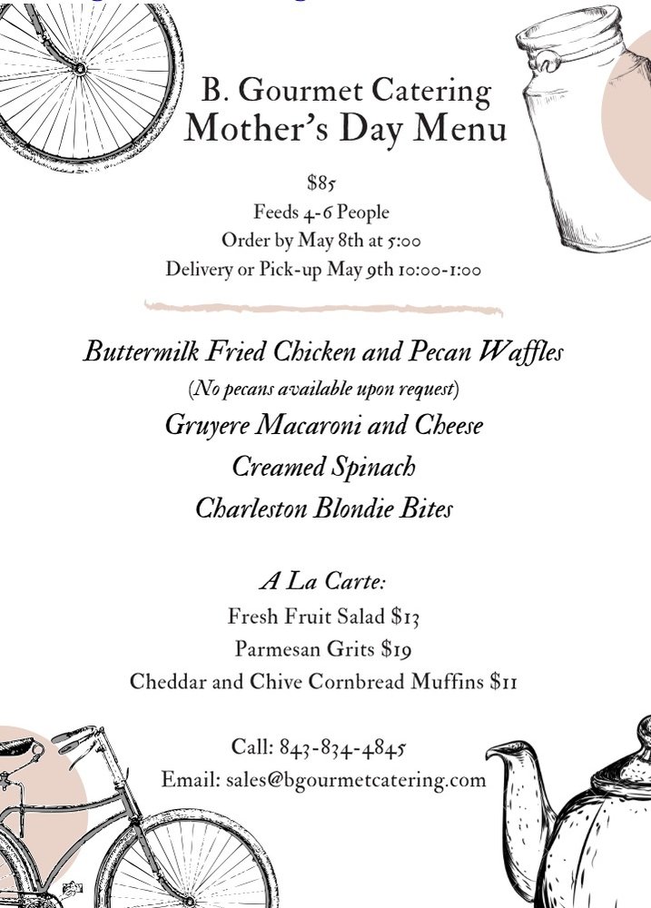 - Mother’s Day Brunch menu will be available for pickup from 10 am to 2 pm on Mother’s Day