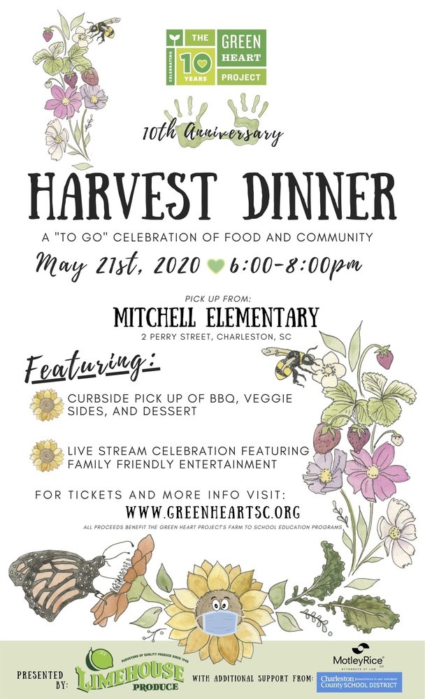 The Green Heart Project, a local nonprofit providing Farm to School education at schools throughout Charleston, invites the community to join its 10th Anniversary Harvest Dinner on Thursday, May 21st with meal pick-up available from 6 pm to 8 pm at Mitchell Elementary School, 2 Perry St, in downtown Charleston.