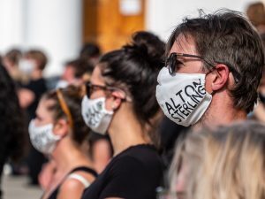 On Monday at the Four Corners of Law, a group of local community members wore masks emblazoned with the names of thirty black citizens killed by police. Solemnly and quietly, demonstrators stood six feet apart on the sidewalk in front of the United States Post Office and Courthouse. On cue, they knelt for eight minutes and forty-six seconds to commemorate George Floyd’s life.