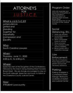 On Thursday, June 11th, a group of South Carolina lawyers will host the Attorneys for J.U.S.T.I.C.E. March & Rally in downtown Charleston. The event begins at 4 pm in front of the Daughters of the Confederacy Museum Building at 188 Meeting Street.
