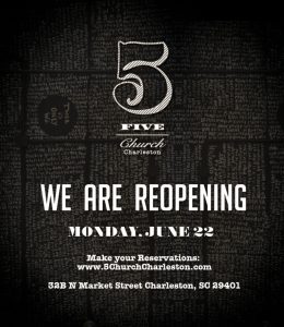 On Monday, June 22nd, 5Church Charleston will re-open for dine-in service and will resume their dinner, brunch, and lunch services.