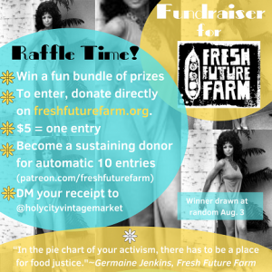 From now until midnight on market day, followers can donate $5 to enter a raffle to win one big prize bundle from local vendors. Each $5 donation = an entry; Becoming a sustaining donor for FFF = 10 entries. Donate directly on freshfuturefarm.org or become a sustaining donor via patreon.com/freshfuturefarm.
