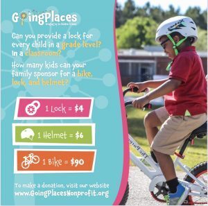 Going Places accomplishes that goal in several ways, but they are most known for providing all students in Title 1 schools (low income/high poverty) with new custom bikes, locks, and helmets.