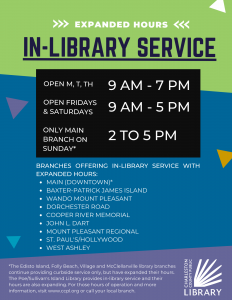 The Main, Baxter-Patrick James Island, Wando Mount Pleasant and Dorchester Road, Cooper River Memorial, John L. Dart, Mt. Pleasant Regional, St. Paul’s/Hollywood and West Ashley library branches will begin operating with expanded hours on Sept. 8. The library branches reopened in August after being closing to the public March 16 due to the COVID-19 pandemic. Those branches will now be open during the expanded hours listed below:
