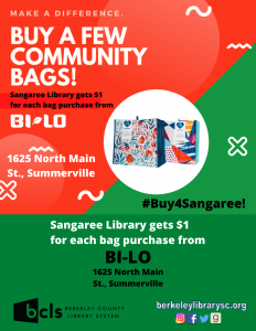 The Berkeley County Library System – Sangaree Library was recently selected as the recipient of the Community Bag Program in a partnership with the BI-LO at 1625 North Main Street in Summerville. The store will provide $1 per bag purchase in September to the library.