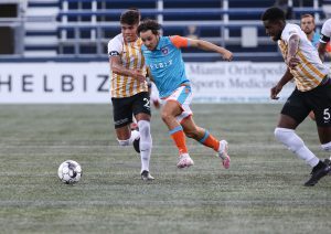 Whether it was the south Florida heat or the first time playing on artificial turf this season, it took much of the first half for the Battery to find their footing again in the first match on the road since August 19th. The Miami FC put pressure on early, showing an energy on the attack unremiscent to the last time these teams played. As early as the 4’ minute mark, Miami nearly scored, but a deflected shot off Battery keeper Joe Kuzminsky allowed defender Leland Archer to kick it away for safety. The Miami side nearly struck twice through the first 45’ as Romario Williams put a shot off a left cross past Kuzminsky into the net but was called back for offsides. Williams almost struck again six minutes later as he took a pass past the Battery back line but shot just over the right corner of the net. While the Battery struggled to put something together in the attacking zone, a brief scare came when Romario Piggot went down, but Stavros Zarokostas came on as Coach Mike Anhaeuser’s first sub for the evening which proved to be a fortuitous change come the second half. For the Battery through the first 45’, the highlight of the night was Joe Kuzminsky’s battling at the goal line with multiple punches and blocks that kept Charleston in the game.
