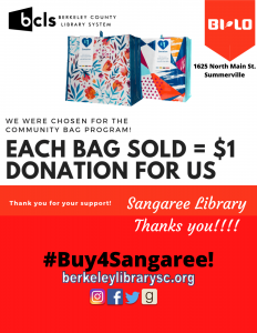 The Berkeley County Library System – Sangaree Library was recently selected as the recipient of the Community Bag Program in a partnership with the BI-LO at 1625 North Main Street in Summerville. The store will provide $1 per bag purchase in September to the library.