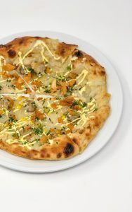 Menu items include Ceviche, featuring local fish and citrus, Umami Tuna “Bombs” with truffle tuna and avocado, and Local Shrimp served with bagnoratte sauce. Prepared in the restaurant’s Mibrasa charcoal oven, the Roasted Clam Flatbread (right) is baked with confit fennel and elephant garlic.